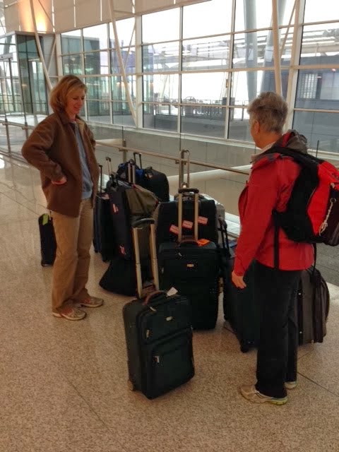 Arriving at the Indy airport. Susan and Diana looking over the ridiculous amount of luggage we brought. Ten checked bags and three full carry-ons for the three of us. Lots of medical supplies! We can check 3 bags each due to frequent flyer status with Delta. We will deal with the one extra bag.